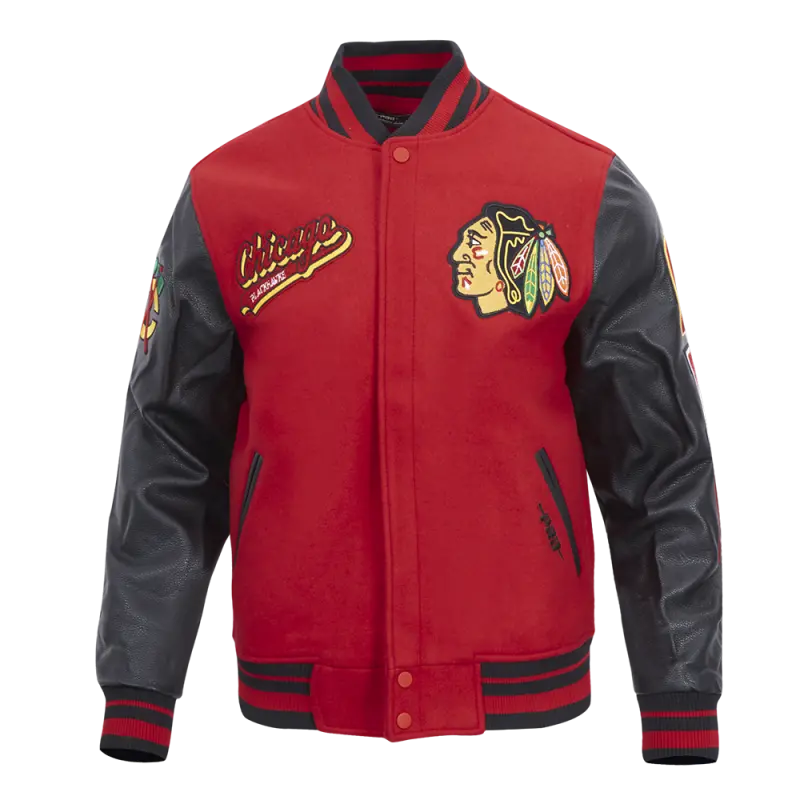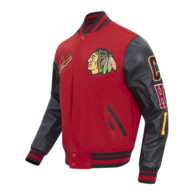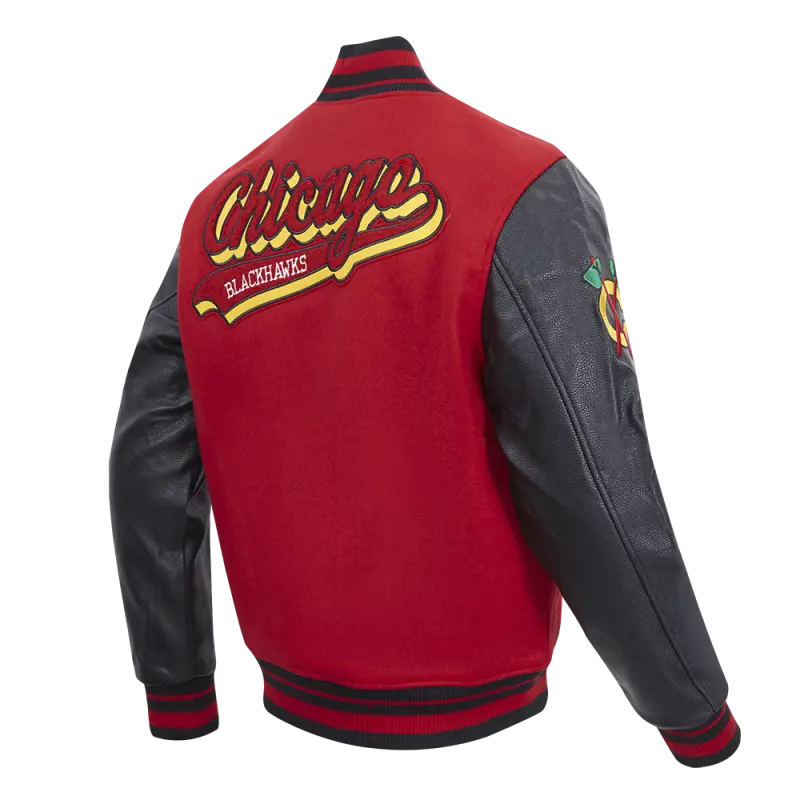 NHL CHICAGO BLACKHAWKS SCRIPT TAIL MEN’S RIB WOOL VARSITY JACKET (RED\/BLACK)